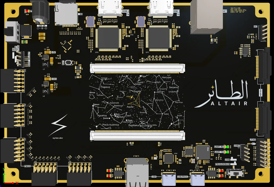 https://www.altium.com/viewer/?token=%2BWfb27nTjk609L4fgLyKE7%2Fqhttps://imgur.com/a/CPrJwV1**Notes:**HDMIs use different banks as Vivado internal noise calculations (SSN) report high noise margins when the entire bank is used at once, especially at higher drive strengths, which might be needed because of the somewhat long trace length. AC termination used (resistors unplaced/DNP) since series termination can't be placed on the SOM. HDMI 2 (left) data, clk, and syncs length matched to +-10mm.Ethernet length matched 2mm between pairs, 1mm within pairs. PHY on SOM; using FPGA hardcore.MIPI length matched 1mm between pairs, 2mm within pairs. Implemented XAPP894 MIPI D-PHY (passively via the resistors you see).JTAG/UART can be used via USB (at the same time) or via headers. Right USB connector can be toggled to be used as normal USB or for prog/debug.USB PHY on SOM, USB Hub on dev boardThere are no power planes, power is routed. All planes are ground. SIG/GND/SIG/GND/GND/SIGUsed return vias whenever possible to minimize reflections within the dielectric.**Possible concerns:**Power inductor choice: XGL4020-222MECHDMI_1V8 and FTDI_1V8 switching on at the same timeLength matching within MIPI pairs seem too much for the amount that they are misaligned.Floating copper (star and constellation) acting as antennae